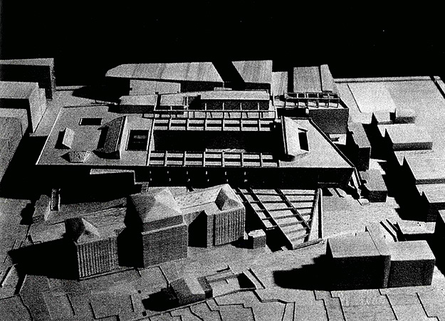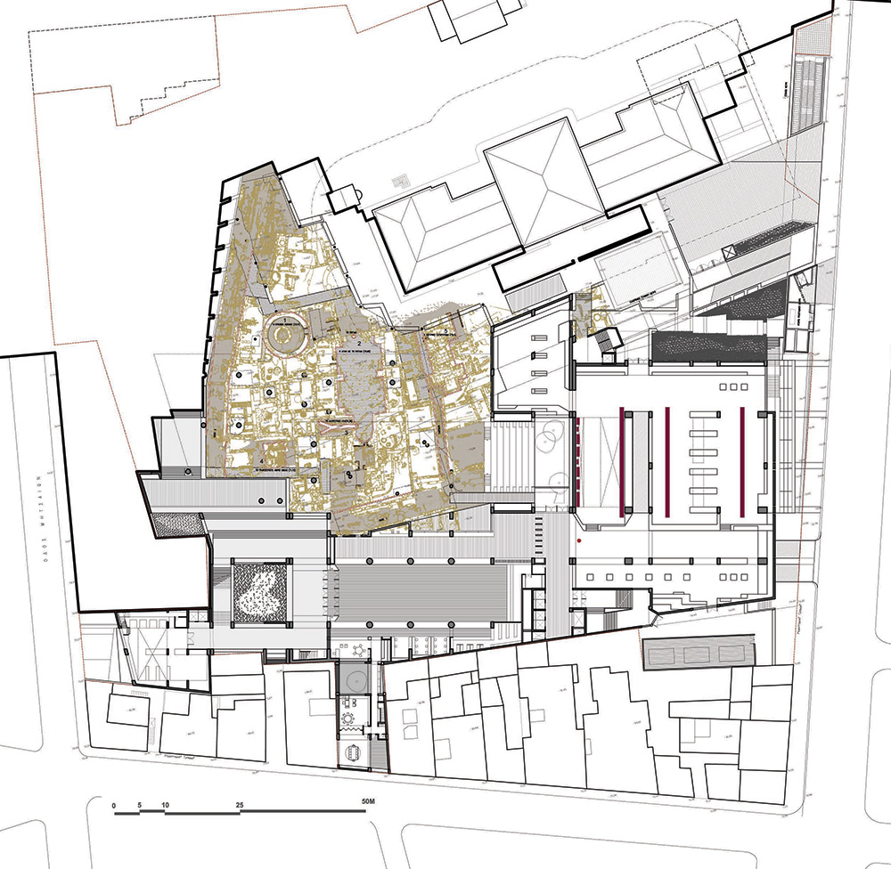 The wide outdoor spaces communicate with each other through the passage created by the excavations at the North side of the Weiler building.