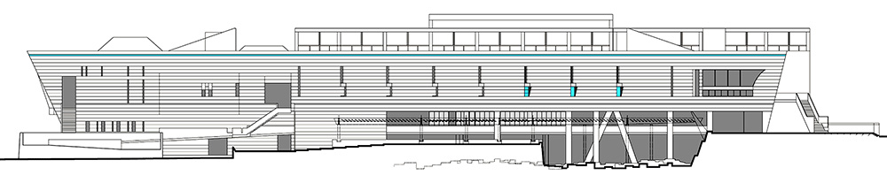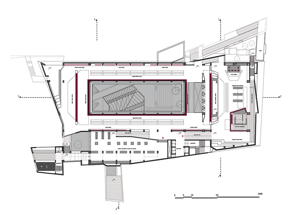 The building is treated as an “arc” located on a particularly charged area of Attica, in the heart of the city, above the traces of history.