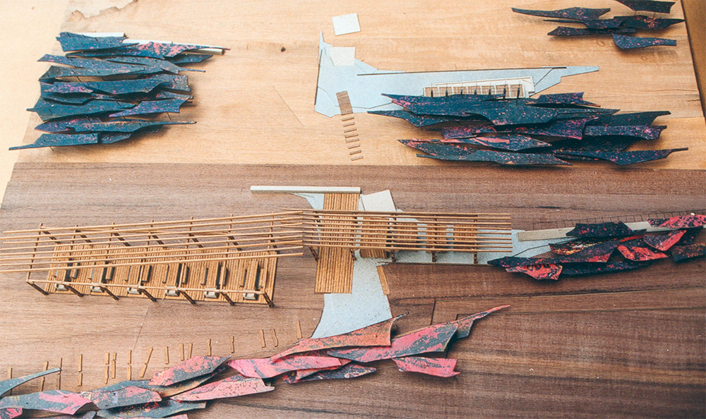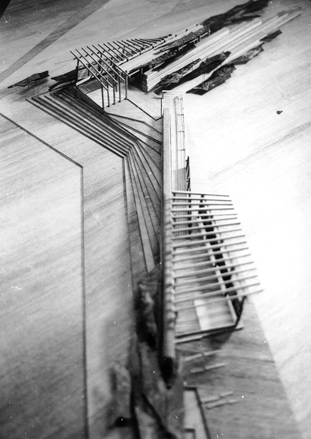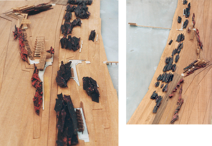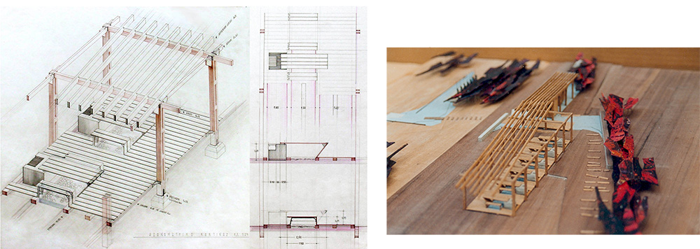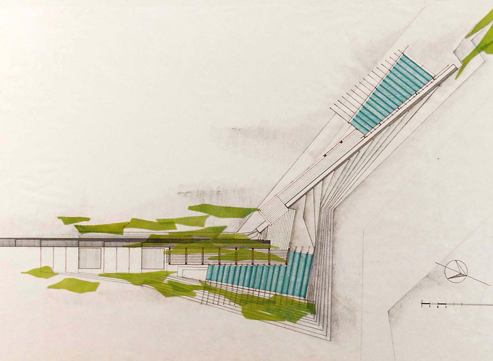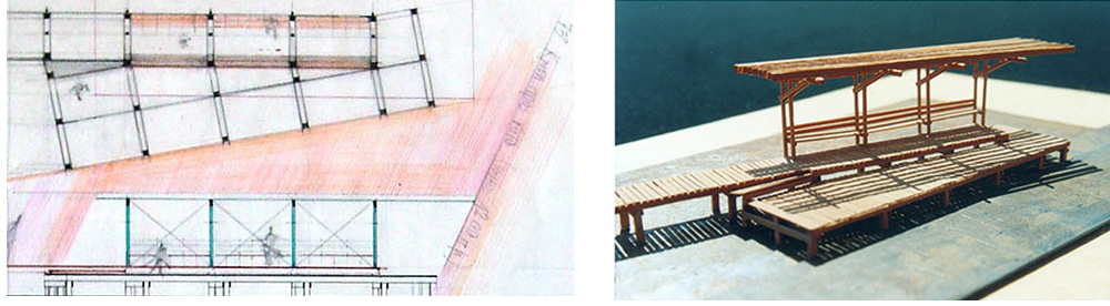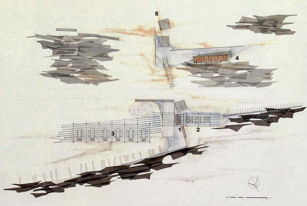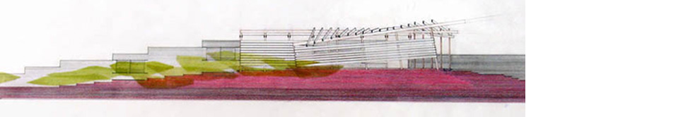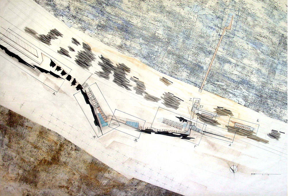 It consists of two supporting wire-framed stones walls. The direction of the walls leads the sight to distinguished points of the lagoon and to the castle at Koryfasion hill. Along the walls the visitor ascends to the observation point through earth steps with wooden risers and along suspended tables of information about ecological and historical facts of the region. The main construction has a wooden bearing structure and is in open space since it is mainly used on summer season. The roof is made of extended fabric and in the future will be substituted by climbing plants. There is a horizontal slot along the wooden wall at the first unit for the kiosk for the observation of the birds.